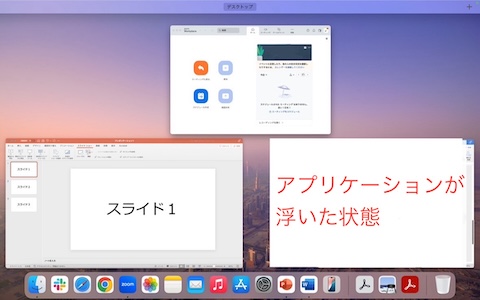 今動いているアプリケーションがデスクトップ上に浮いた状態になります。