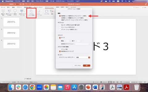 パワーポイントが全画面表示されていてDockの操作ができない!