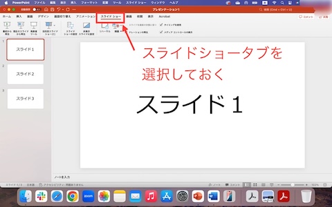 使いたいパワーポイントの資料を開いて、スライドショータブを出しておきます。