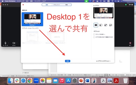 2.どのウィンドウを共有するか選べるので、Desktop1を選んで一旦画面共有を有効にする