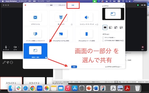 4.再びzoom画面の共有をクリック→画面タブにアプリケーションウィンドウが表示されるので、スライドのみになっているウィンドウを選んで共有をクリック