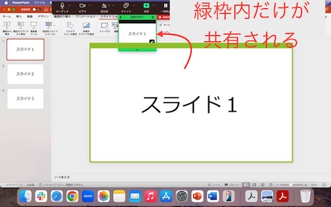 自分側には画面全体が見えるが、参加者には緑の枠内だけが画面共有される
