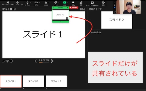 自分側には発表者ツールが見えるが、参加者にはスライドだけが画面共有される