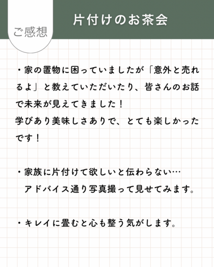 ・家の置物に困っていましたが「意外と売れるよ」と教えていただいたり、皆さんのお話で未来が見えてきました!
