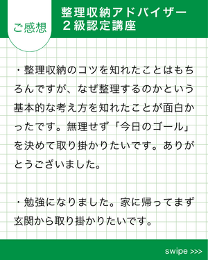 ・整理収納のコツを知れたことはもちろんですが、なぜ整理するのかという基本的な考え方を知れたことが面白かったです。